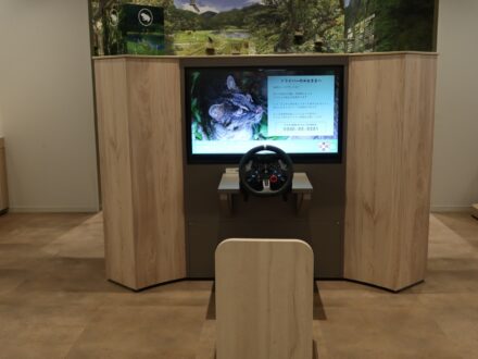 西表島・古見地区にある「西表野生生物保護センター」には、「ヤマネコに優しい運転」を実践練習できるドライブシミュレーターがあります。西表島の道路でスピードを出しす
