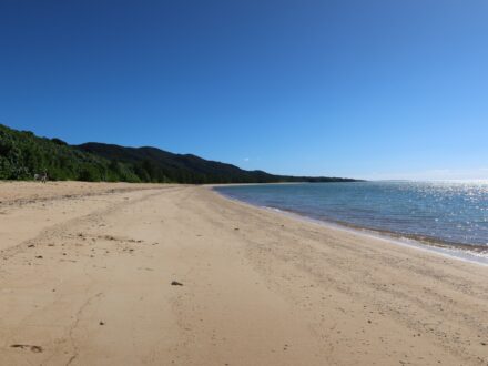 西表島の南端に広がる南風見田の浜は、約2kmにわたる島随一のロングビーチです。白い砂浜と遠浅の海が特徴で、天気の良い日には波照間島を望むことができます。手つかず
