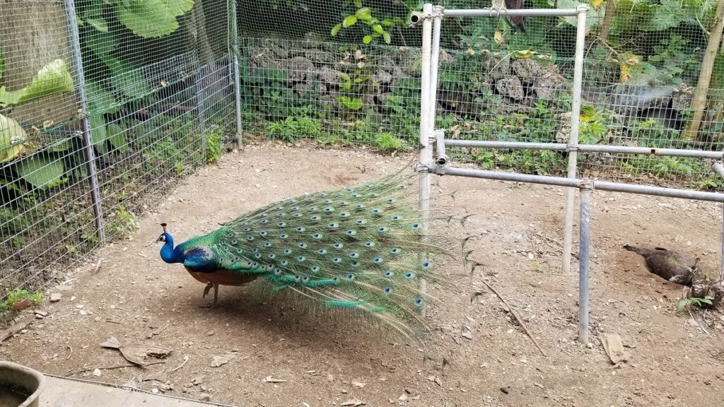 黒島研究所にはクジャクもいます。黒島は野生のクジャクもいて害鳥ではあるのですが、羽を広げると本当にきれいです。調べてみると、羽が派手でキレイなのはオスのようです。
