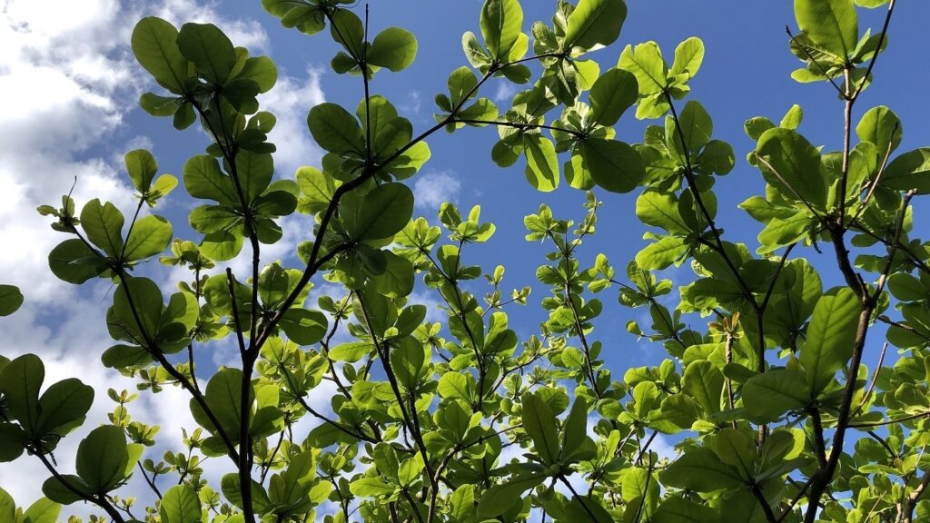 常緑樹の多い八重山で、紅葉して葉を落とす代表的な樹木のひとつがクヮーデーサー(モモタマナ)です。ついこの間まで、曇り空の下で枯れ木のようだったのに、今日は青空に向かってたくさんの美しい若葉が広がっていました。
