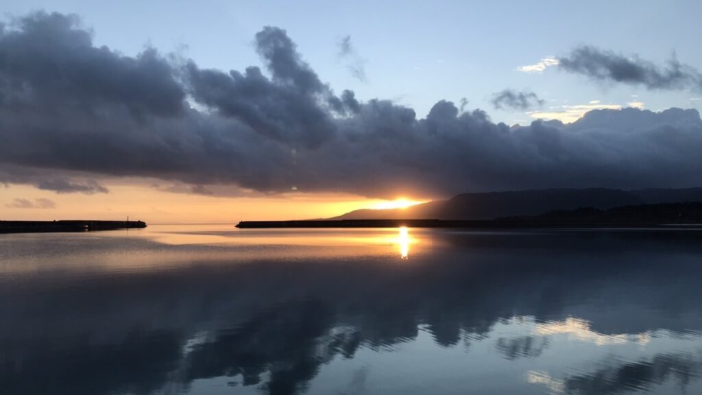 今日の西表西部の様子です。鏡のように海面に映っている朝日がとても美しい風景です。