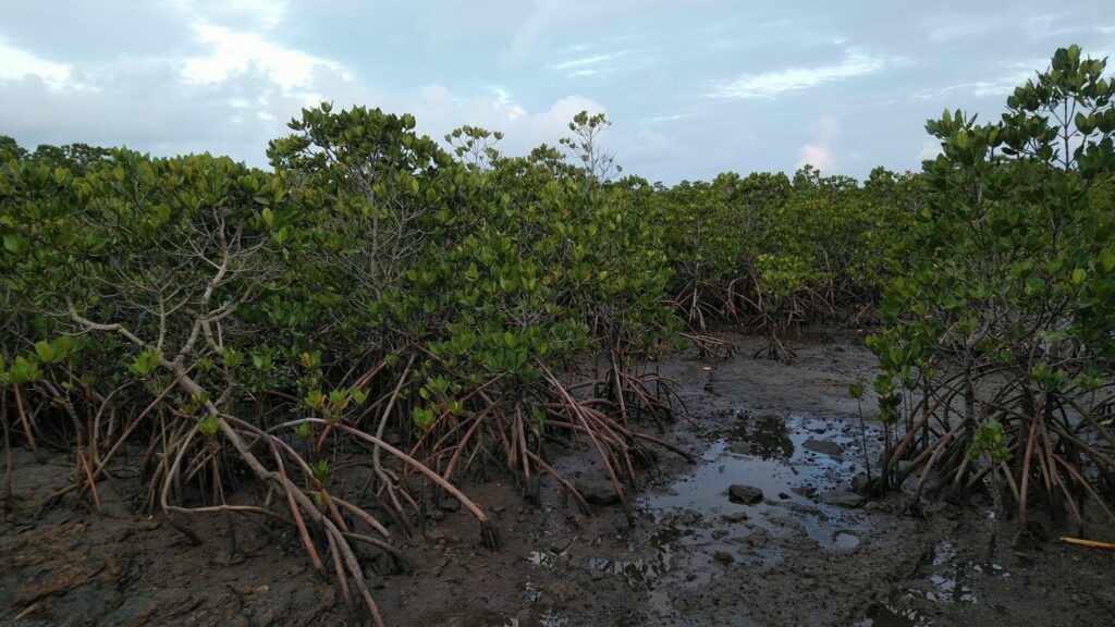 小浜島の石長田海岸では、目の前にマングローブ林を見る事が出来ます。マングローブとは植物の名前と思われがちですが、満潮になると海水が満ちて来るところに生えている植物の総称です。