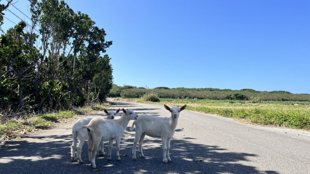 波照間の集落から少し離れたところでは多くのヤギの姿を見ることができます。そのほとんどは紐で繫がれているのですが、たまに写真のように道路の真ん中で遭遇することがあります。近寄るとゆっくり去っていくのですが、波照間島観光の際、車などで島内を移動する際は人だけでなくヤギにもお気を付けください!