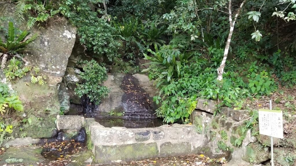 上の川は古くから船浮村の水瓶として人々の生命を守り、農業(稲作)を育んできた。炭鉱の時代(明治)には上の川の水は良質で療養に効果があるといって訪れる人が多かった。丸い水溜めは長い間洗濯のすすぎ場として使用されてきた。(看板より抜粋)