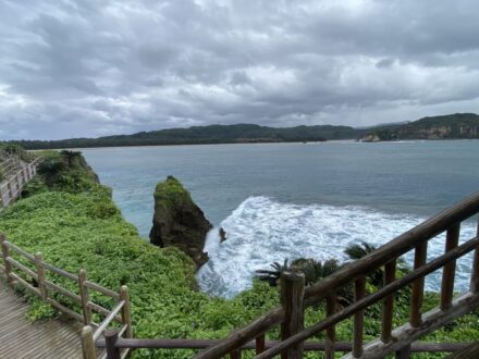 西表島西部に位置するうなりざき公園展望台は、島の雄大な自然を間近に感じられる場所です。整備された遊歩道を進むと、視界が一気に開け、眼下には岩礁と波が打ち寄せる海