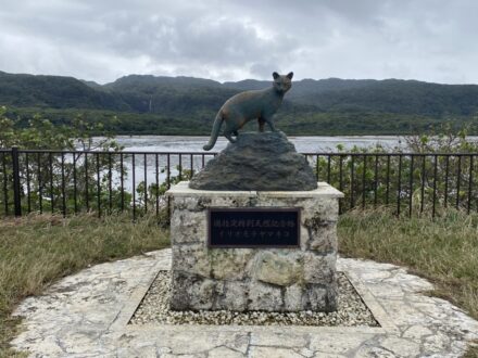 西表島西部、海中道路沿いの緑地帯に設置されているのが、このイリオモテヤマネコの銅像です。正面には海が広がり、その先には島を代表する景観の一つ、ピナイサーラの滝を