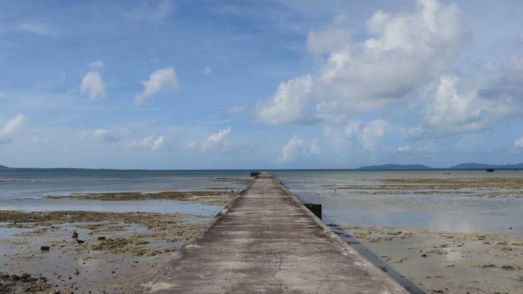 海へまっすぐ伸びている伊古桟橋。全長354mもあり、先の方まで歩いていくと、まるで海の上を歩いているような気分です。