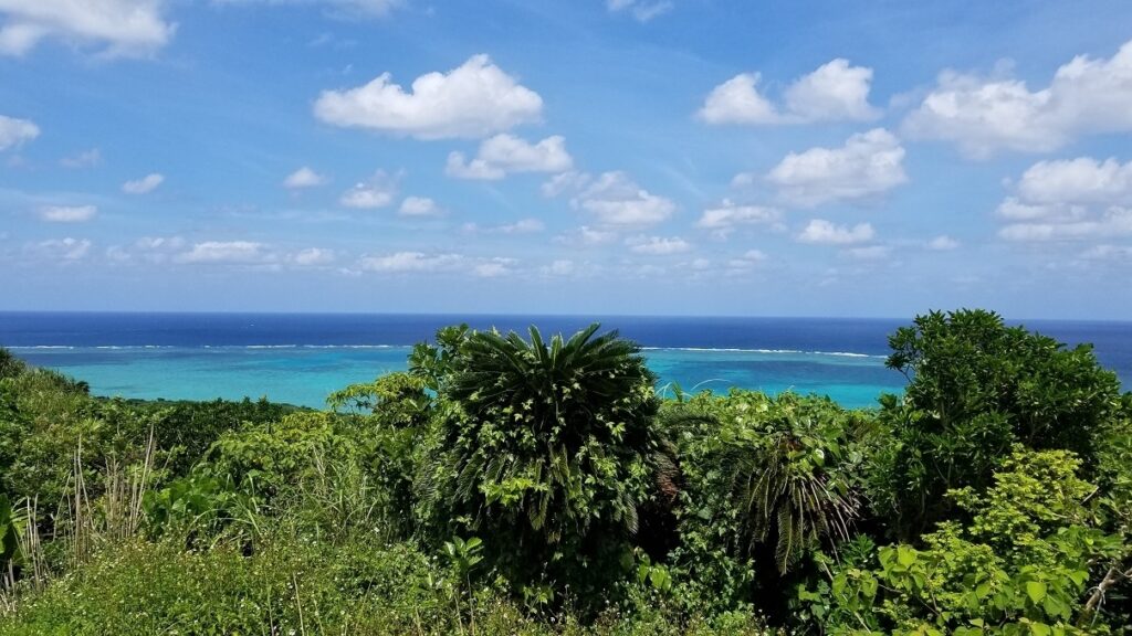 木の陰になって見えませんが左手前方には鳩間島が見える方向です。見る方向によって海の色もそれぞれ違って、お気に入りの海の色を探すのが楽しいです。