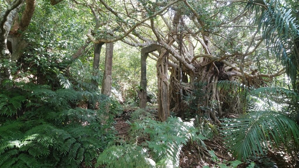 西表島の東部にある「大見謝(おおみじゃ)ロードパーク」は、ドライブの休憩に最適な隠れた自然スポットです。 駐車場から階段を降りると、そこは鬱蒼とした亜熱帯のジ