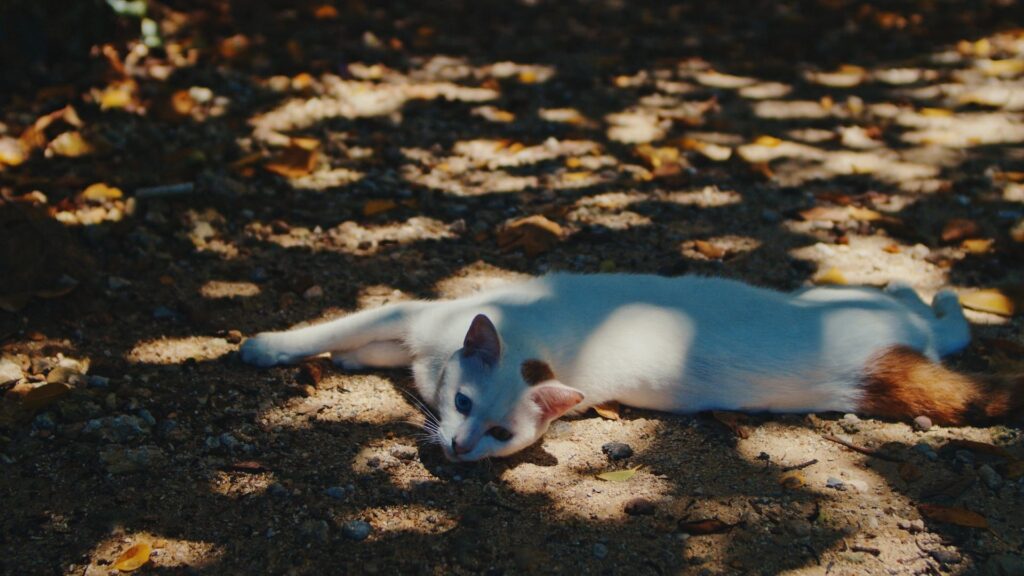 島の猫はとてものんびり。がじゅまるの木漏れ日で日向ぼっこ。