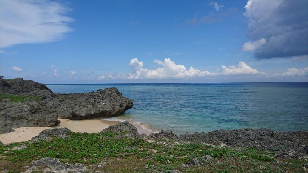 鳩間中森を通り過ぎ、そのまま真っすぐ北へ歩いていくと、突き当たるのが島仲浜。鳩間島の北側半分は、こうした岩場の間に小さな浜が点々としています。誰もいない静かな浜を独占できるのは、鳩間島ならではです。