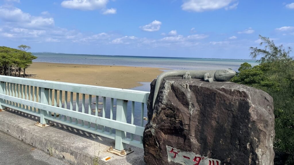 ゲーダ川の欄干の上にトカゲ(ヤモリ?)のオブジェがありました。西表島にはたくさんの橋がありますが、それぞれデザインが違い、欄干を見て回っても楽しめます。