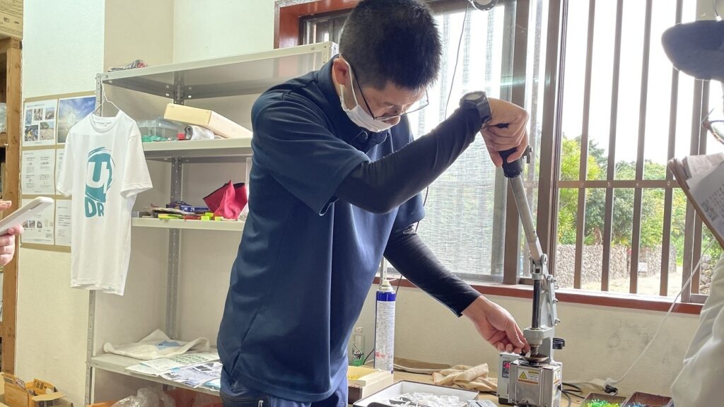 竹富島地域自然資産財団へお邪魔してきました。財団では、海岸に漂着するプラスチックゴミをキーホルダーに生まれ変わらせる取り組みのお手伝いを行っています。これはプラスチックを熱で溶かし、成型しているところです。