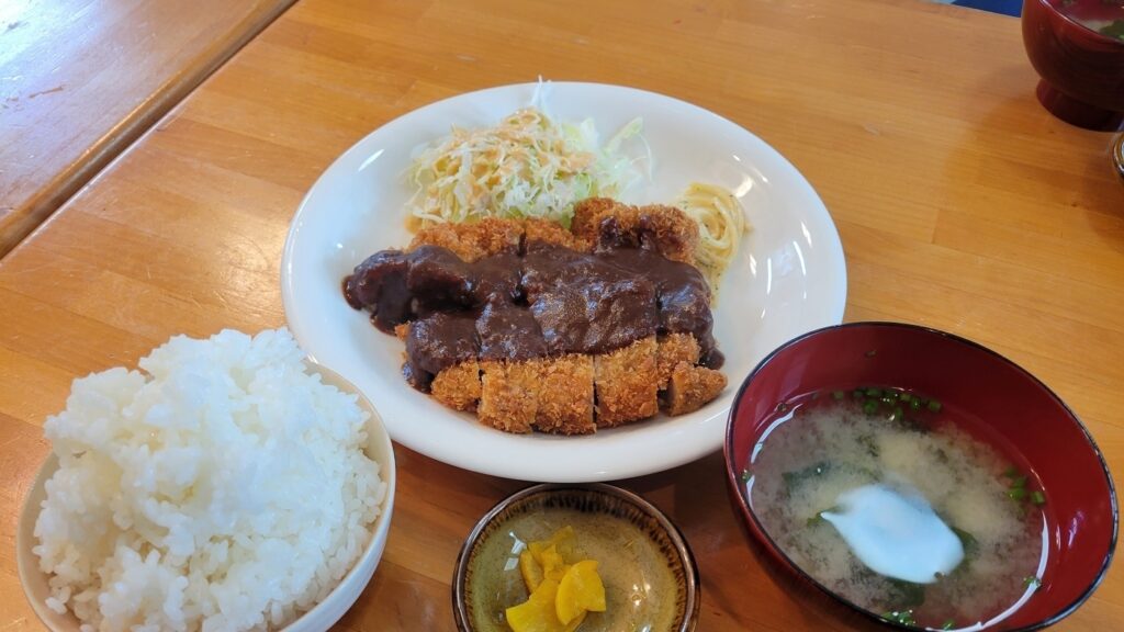 西表島白浜にて、ボリュームたっぷりのとんかつランチです!油淋鶏もあったのですが…写真を撮る前に食べてしまいました。