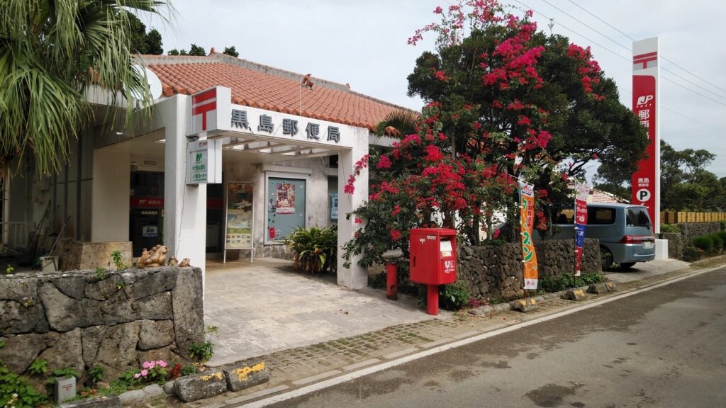 黒島の郵便局です。離島の郵便局は沖縄らしい建物が多く、お出迎えをするブーゲンビリアもキレイですね。