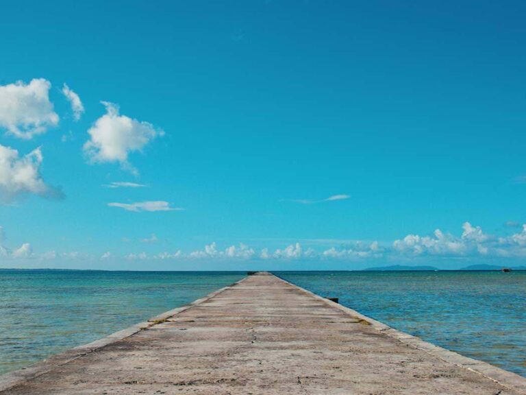 西表島・大原港の桟橋から、防波堤の先にそっと姿を見せる新城島(パナリ島) 遠くに見える島影は、手つかずの自然と島民の暮らしを感じさせ、島時間の旅の始まりを予感さ