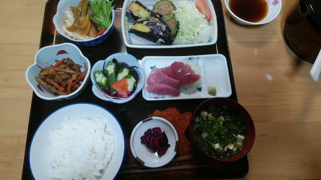 黒島の民宿での夜ご飯です。ゴーヤの肉詰めにお刺身にとボリュームたっぷりで美味しくいただきました。